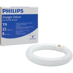 The Philips 22-Watt 8 in. T9 Daylight Deluxe Circline Fluorescent Light Bulb (FC8T9/DX) can be used for a variety of commercial and residential lighting applications. This light bulb provides a vibrant, white glow that helps create a cool and refreshing environment. This bulb can shine for as long as 12,000-hours, making it ideal for bathrooms and laundry rooms.
