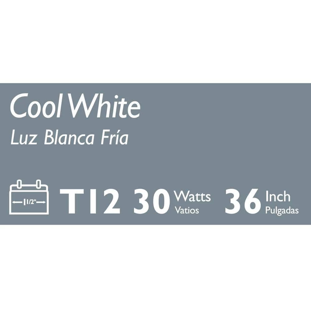 Philips Linear Fluorescent 30-Watt T12 is a Cool White bulb (F30T12/CW) designed for residential and commercial general-purpose lighting applications. These bulbs cast a cool, white beam of light, making them perfect for garages, basements or workshops. Philips Linear Fluorescent T12 light bulbs feature ALTO Lamp Technology.