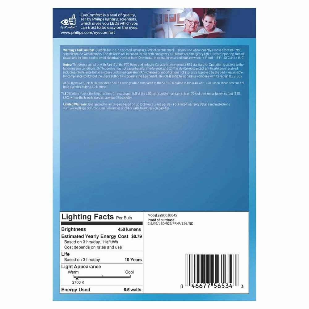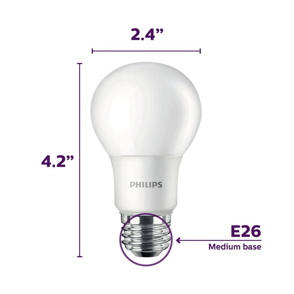 The Philips 40-Watt equivalent A19 LED bulb is specifically designed to light your home with a frosted, a-shaped glass bulbs. Enjoy comfortable soft-white light with familiar shapes you know and love. These frosted glass LED bulbs use significantly less energy than traditional incandescent light bulbs. This frosted glass bulb has a medium (E26) base.