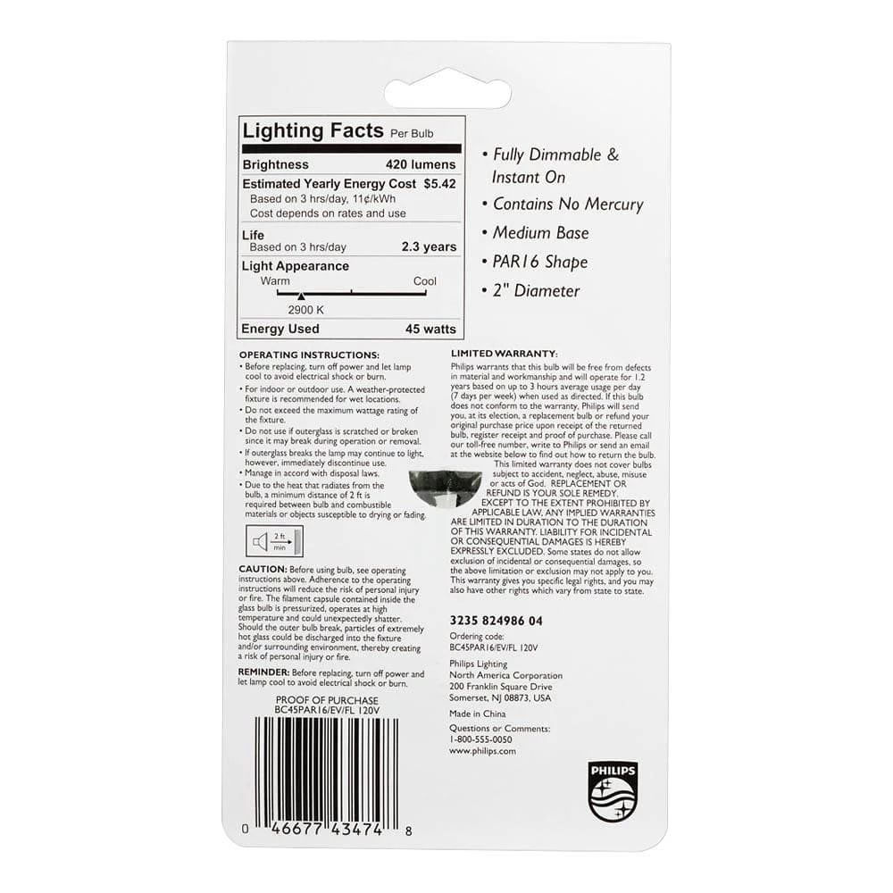 The Philips 45-Watt EcoVantage Flood Light Bulb can shine for up to 3,000 hours. This flood bulb provides a round beam of bright, white light making this bulb ideal for your home or business’s recessed can or track lighting fixtures. You can also use this bulb for your outdoor security lighting applications as well.