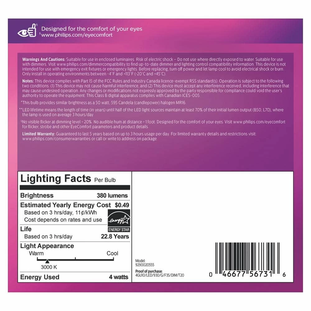 The Philips LED 50-Watt Equivalent GU10 spot light bulbs are a perfect replacement for halogen spots. They have a warm halogen-like light with the performance and long life you expect from LED. Ideal for accent lighting.