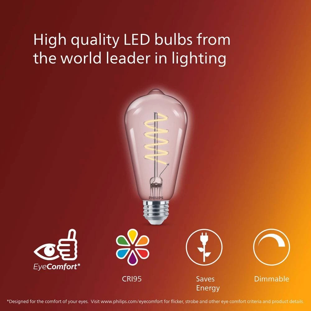 This Vintage LED Amber Spiral Filament bulb is designed to be seen. This nostalgia-inspired dimmable LED bulb allows you to create an extra cozy ambiance with deep amber tones. Vintage LED bulbs also meet our Eye Comfort criteria, a standard we developed to measure our products against a set of key factors that can impact the comfort of your eyes.