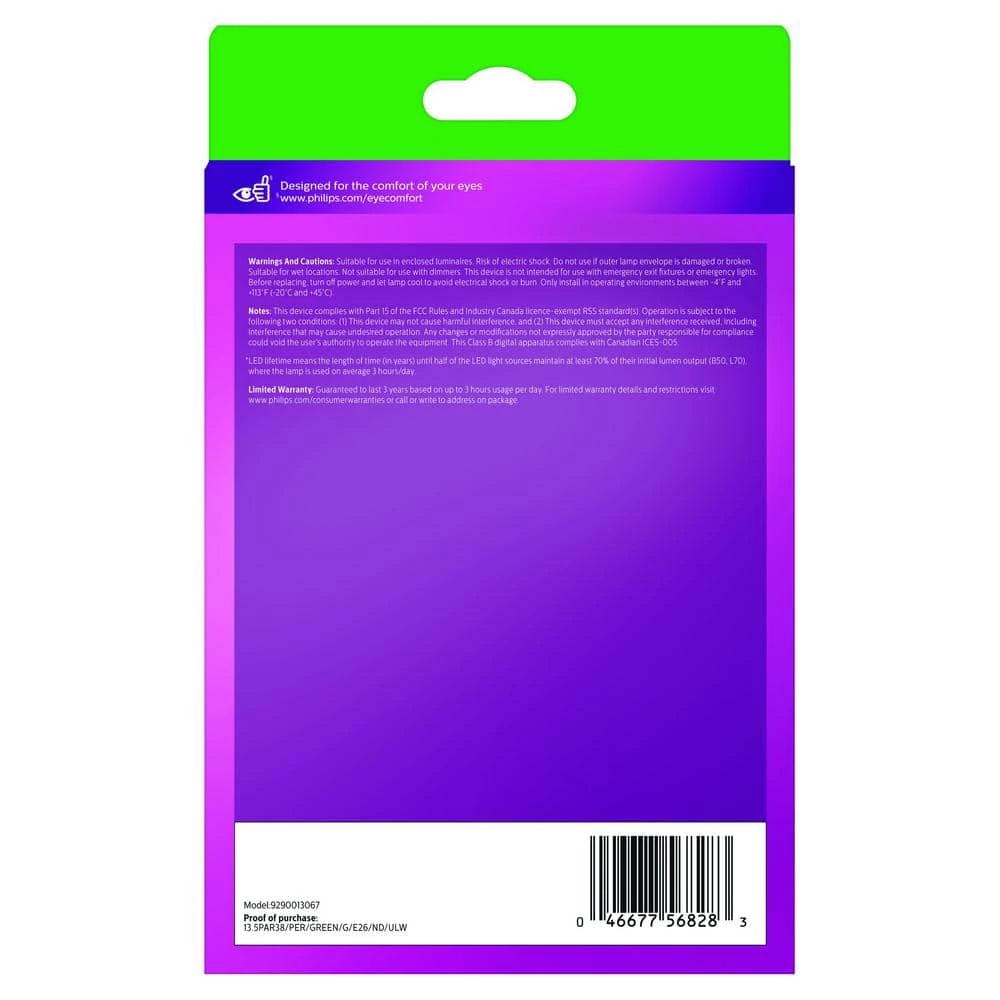 This Philips LED bulb lights up in bright green, while offering the benefits of lifetime and energy savings of LED technology. Great for parties and holidays. Lights up a vibrant color, to create custom environments for special occasions. With a lifetime of over 10,000-hours, use the same bulb to mark the event for years to come.