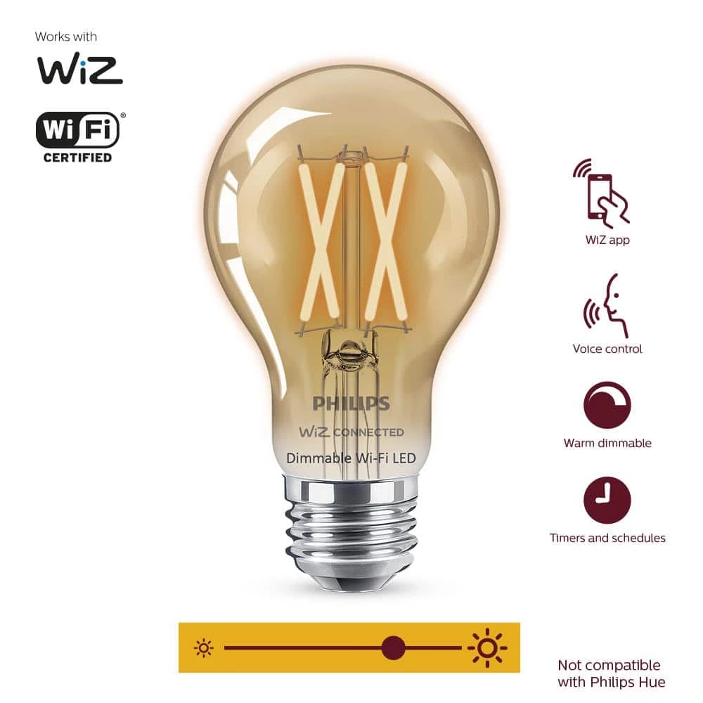 Enhance the lighting in your home with this amber A19 LED 40W equivalent dimmable smart Wi-Fi WiZ connected wireless light bulb. You can control the brightness from your mobile device with the WiZ app. For more convenience, this bulb is compatible with Amazon Alexa, Google Assistant and Siri Shortcuts.