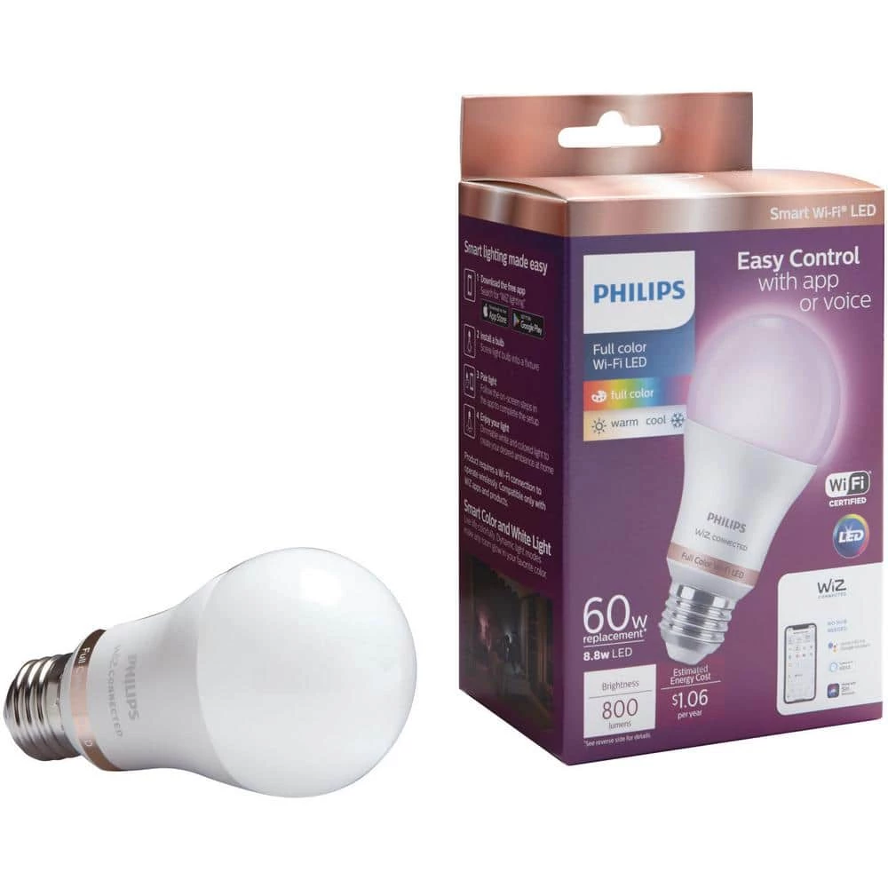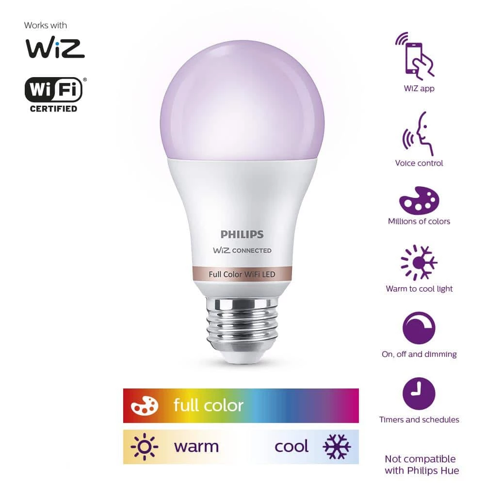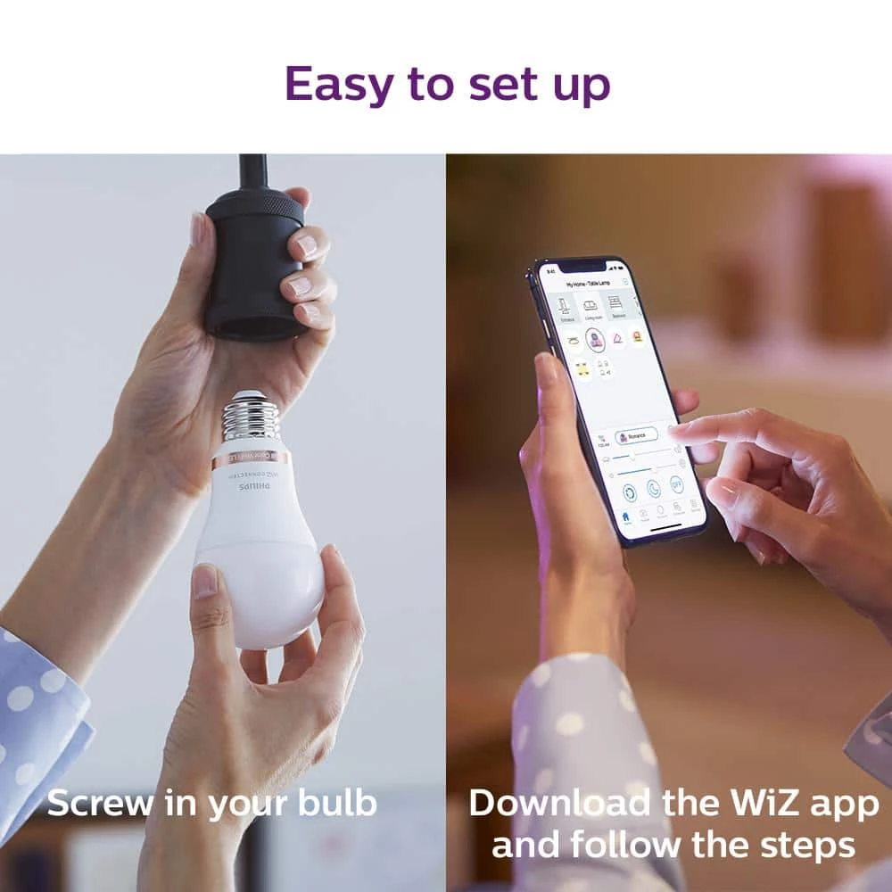 Philips Smart Wi-Fi LED lighting puts you in complete control of your lighting with smart bulbs that are easy to use, functional and affordable. We’ve made all your favorite high-quality Philips bulbs smarter, just connect them to your existing Wi-Fi network. Smart Color and White Light – Live life colorfully. Dynamic light modes make any room glow in your favorite color. Control your lights wherever you are using the WiZ app or your favorite compatible voice control device. Product requires a WiFi connection to operate wirelessly. Compatible with WiZ apps and products along with Google Assistant, Alexa and Siri Shortcuts.