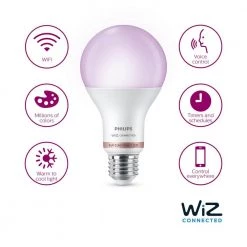 Philips Smart Wi-Fi LED lighting puts you in complete control of your lighting with smart bulbs that are easy to use, functional and affordable. We’ve made all of your favorite high-quality Philips bulbs smarter, just connect them to your existing Wi-Fi network. Philips Wi-Fi lighting is WiZ-connected and controlled with the WiZ app. This Smart Color and Tunable White 100-Watt equivalent A-shape bulb lets you live life colorfully. Dynamic light modes make any room glow in your favorite color. Or use tunable white light that adjusts from relaxing warm white to energizing cool daylight. Use app presets to choose the perfect lighting for your daily activities. With this smart A21 bulb you can play with millions of colors, thousands of shades of white and enjoy pre-set well-being modes to find the perfect light temperature. Control your lights wherever you are using the WiZ app or your favorite compatible voice control device. This product requires a Wi-Fi connection to operate wirelessly. Compatible with Google Assistant, Alexa and Siri Shortcuts.