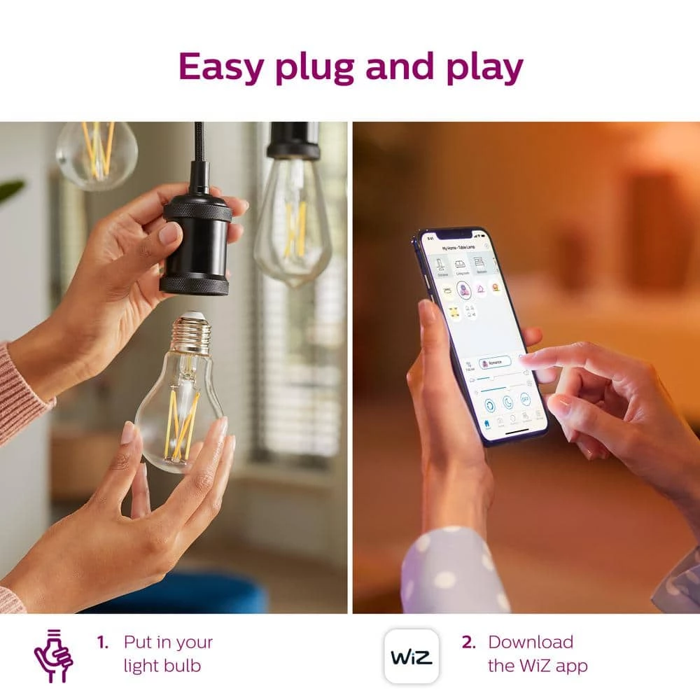 Philips Smart Wi-Fi LED lighting puts you in complete control of your lighting with smart bulbs that are easy to use, functional and affordable. We’ve made all of your favorite high-quality Philips bulbs smarter, just connect them to your existing Wi-Fi network. This Filament A15 Clear Tunable White E26 lets you enjoy light that adjusts from relaxing warm white to energizing cool-daylight. Use app presets to choose the perfect lighting for your daily activities. with Philips Smart Wi-Fi LED tunable lighting you can play with thousands of shades of white and enjoy pre-set well-being modes to find the perfect light temperature. Control your lights wherever you are using the WiZ app or your favorite compatible voice control device. This product requires a Wi-Fi connection to operate wirelessly. Compatible with WiZ apps and products along with Google Assistant, Amazon Alexa and Siri Shortcuts.